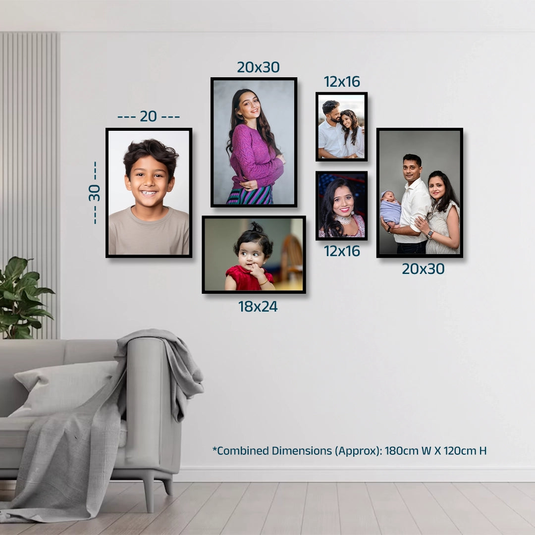 6Capture your priceless moments with our sleek photo frame collage set, designed to add a personal touch and elegance to any room. Featuring four contemporary black frames in varied sizes, this arrangement creates a visually appealing gallery wall that's perfect for showcasing family portraits, candid memories, or special occasions. The minimalist layout blends seamlessly with both modern and classic decor styles, making it a striking focal point in your living room, hallway, or bedroom.